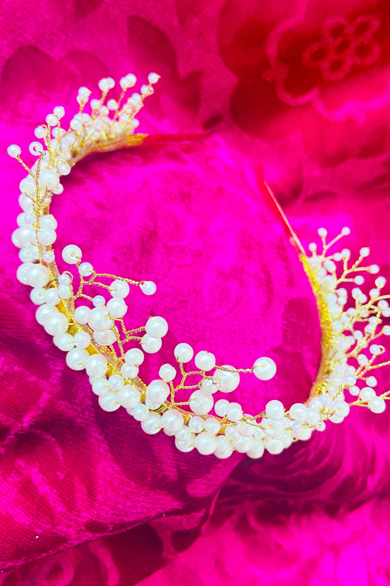 تاج مرواریدی مناسب مراسم عروسی، نامزدی، تولد و ... متریال استفاده شده: مروارید سنگی براق با کیفیت رنگ ثابت